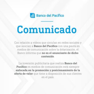 Con relación a videos que circulan en redes sociales y que asocían a Banco del Pacífico con una pauta en medios de comunicación sobre la dolarización, el Banco informa que no es el anunciante de dicho contenido.